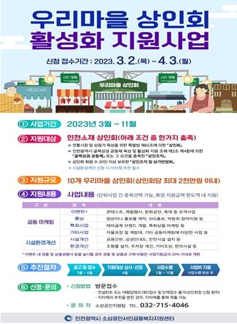 사업 신청·접수는 3월 2일부터 4월 3일까지며, 신청을 원하는 상인회는 인천시 소상공인서민금융복지지원센터에 직접 방문해 신청하면 된다.