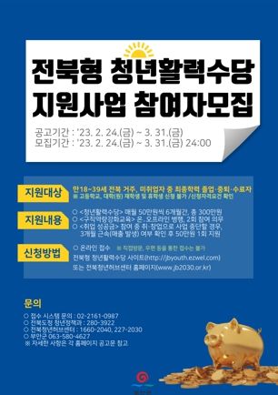 접수 기간은 2월 24일부터 3월 31일까지이며, 전북형 청년활력수당 누리집 또는 전북청년허브센터를 통해 온라인으로 신청할 수 있다.