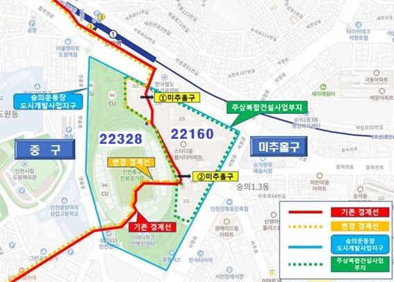 인천시 중구와 미추홀구의 관할구역을 변경하는 '인천광역시 중구와 미추홀구의 관할구역 변경에 관한 규정'(대통령령)이 지난 2월 14일 국무회의에서 의결됨에 따라 이번 국가기초구역 조정대상에 포함했다.
