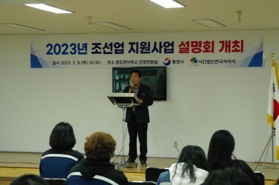 인사이드피플 김성연 기자 | 통영시는 지난 9일 통영시 광도면사무소 안정민원실에서 사단법인 한국커리어와 함께‘2023년 조선업 지원 사업 설명회’를 개최했다.