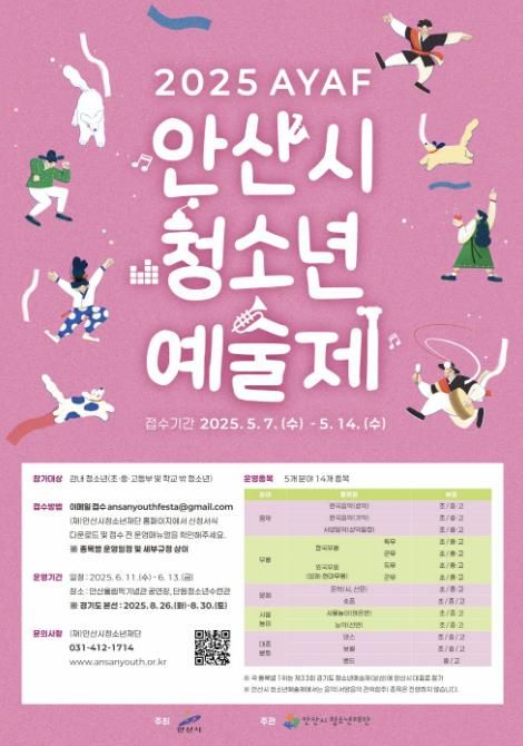 안산시가 주최하고 (재)안산시청소년재단이 주관하는 2025년 안산시 청소년예술제는 청소년의 예술적 재능과 열정을 마음껏 펼칠 수 있는 청소년 문화축제의 장이다. 관내 초·중·고등학생(초등학교는 3학년 이상)과 학교 밖 청소년은 누구나 참가할 수 있다.