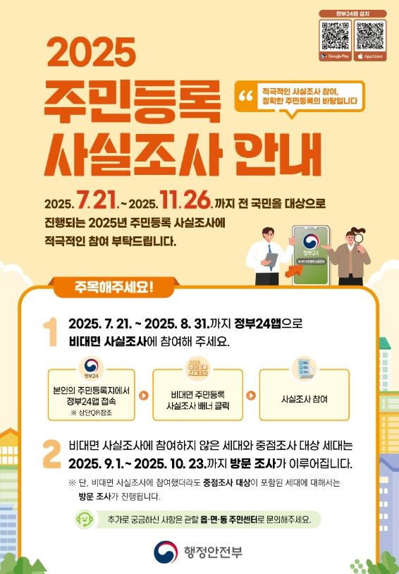 주민등록 사실조사는 주민등록지와 실거주지의 일치 여부를 조사하는 것으로 비대면-디지털 조사(7.21.∼8.31.)를 진행한 이후, 면·동 합동조사반이 방문 조사(9.1.∼10.23.)하는 방식으로 진행된다.