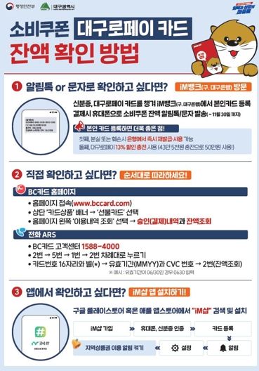 본인등록을 하지 않은 무기명 대구로페이 카드는 BC카드 홈페이지*, BC카드 고객센터 ARS**(☏ 1588-4000), 또는 iM뱅크 영업점 방문을 통해 소비쿠폰 잔액과 결제 내역을 확인할 수 있다.