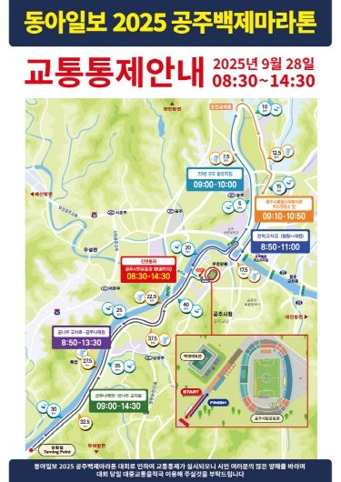 아울러 풀코스 반환점이 있는 나래원 방향의 백제큰길도 오전 8시 50분부터 오후 2시 30분까지 통제된다.