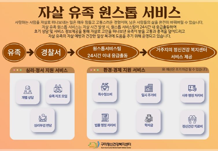 세계보건기구(WHO)에 따르면, 한 사람의 자살은 약 5~10명의 주변인에게 영향을 미치는 것으로 알려져 있다. 이에 구미시는 자살 유족 발생 즉시 경찰이나 소방의 요청을 받아 현장에 긴급 출동 하여, 유족에게 적시에 필요한 서비스를 원스톱으로 제공하고 이를 통해 유족들이 겪는 복합적 어려움을 해소하도록 돕는다.