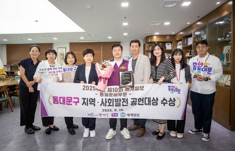 인사이드피플 노재현 기자 | 서울 동대문구는 ‘통일준비 도시’의 모범사례로 인정받았다. 구는 지난 18일 열린'제10회 세계일보 지역·사회발전 공헌대상'시상식에서 ‘통일준비 부문’ 수상의 영예를 안았다. 이번 수상은 전국 기초자치단체 가운데 유일한 통일 분야 수상 사례다.