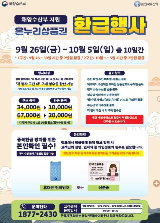 이번 행사는 모두 국내산 수산물만을 대상으로 하며, 젓갈류 등 국내산 원물 70% 이상을 사용한 가공식품도 포함된다. 다만 수산대전 모바일상품권 구매 품목, 정부 비축 수산물, 일반음식점과 수입 수산물은 행사 대상에서 제외된다.