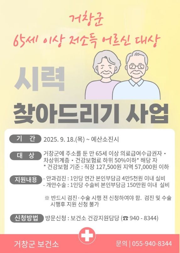 지원 대상은 거창군에 거주하는 의료급여수급권자 및 건강보험료 기준(직장가입자 127,500원 이하, 지역가입자 57,000원)에 해당하는 65세 이상 노인이다. 대상자에게 안과 검진과 개안수술을 지원하여 이를 통해 시력 저하로 겪는 일상생활 불편과 심리적 위축을 줄이고, 어르신들 삶의 질 향상과 사회적 고립 예방에도 기여할 것으로 기대된다.