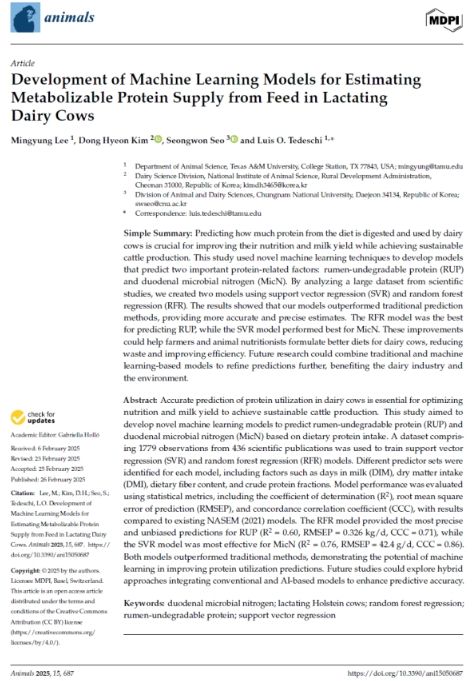 두 가지 예측 모형은 젖소에게 공급되는 핵심 단백질인 ‘반추위에서 분해되지 않고 소장에서 흡수되는 단백질(RUP)’과 ‘반추위 미생물이 사료를 분해하며 합성하는 단백질(MicN)’을 정확히 예측할 수 있도록 설계됐다.