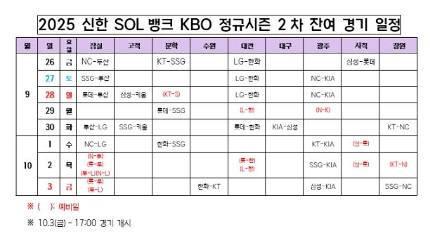 인사이드피플 조은설 기자 | KBO는 26일(금) 2025 신한 SOL뱅크 KBO 정규시즌 2차 잔여 경기 일정을 확정했다.