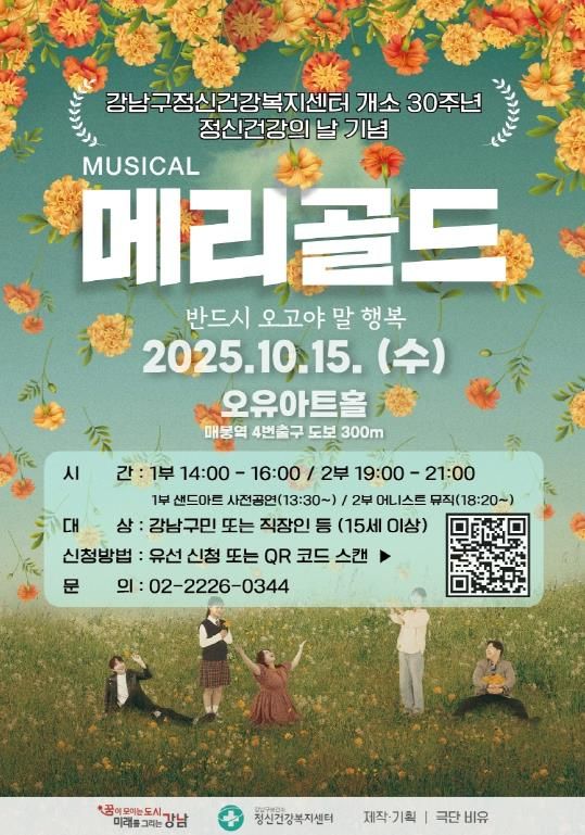 인사이드피플 강애자 기자 | 꿈이 모이는 도시, 미래를 그리는 강남구가 정신건강복지센터 개소 30주년과 세계정신건강의 날(10월 10일)을 기념해, 오는 10월 15일 오후 2시와 7시, 오유아트홀(남부순환로378길 34-9)에서 구민과 함께하는 특별 뮤지컬 ‘메리골드 – 반드시 오고야 말 행복’을 개최한다.