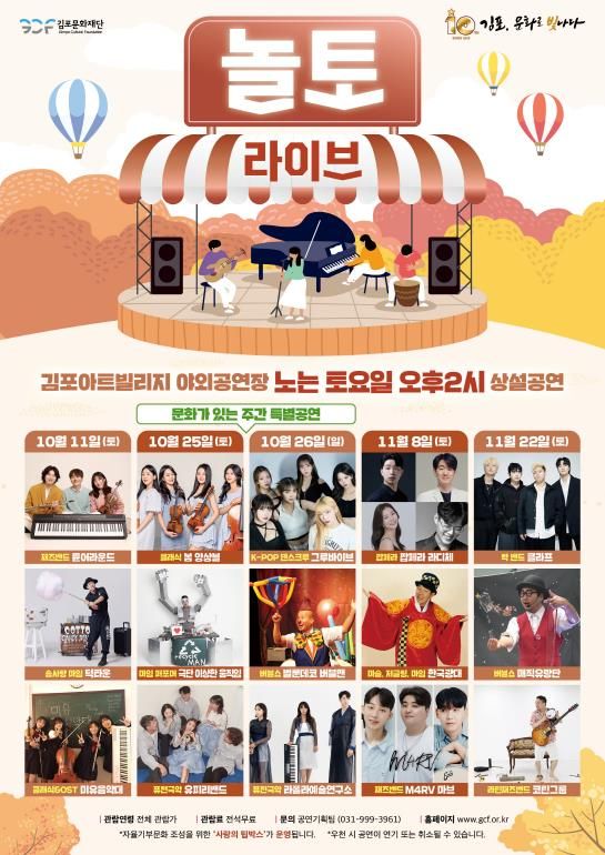 인사이드피플 강애자 기자 | (재)김포문화재단은 10월 11일부터 11월 22일까지 매월 둘째, 넷째 주 토요일마다 김포아트빌리지 야외공연장에서 하반기 토요상설공연 '놀토 라이브'를 개최한다고 밝혔다.