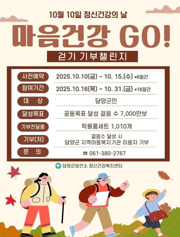 인사이드피플 노재현 기자 | 담양군은 10월 10일 ‘세계 정신건강의 날’을 맞이하여 전 군민을 대상으로 걷기 기부 챌린지를 운영한다고 밝혔다.
