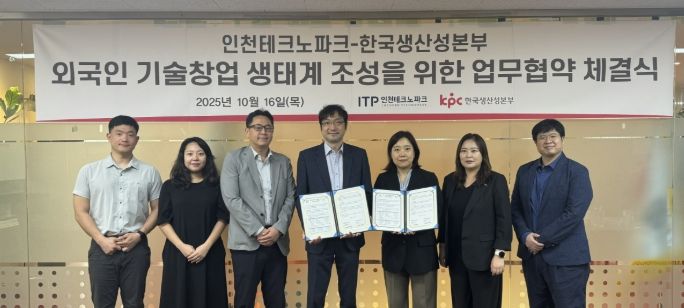 인사이드피플 심정보 기자 | 인천테크노파크는 지난 16일 한국생산성본부와 ‘외국인 창업 활성화 및 창업 생태계 조성을 위한 업무협약(MOU)’을 체결했다.