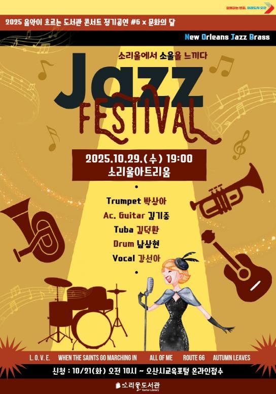 인사이드피플 강애자 기자 | 경기도 오산시는 오는 10월 29일 오후 7시, 소리울도서관 3층 소리울아트리움에서 '2025 음악이 흐르는 도서관 콘서트 정기공연 #6 × 문화의 달 – Jazz Festival; 소리울에서 소울을 느끼다'를 개최한다고 밝혔다.