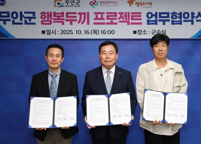 인사이드피플 노재현 기자 | 전남 무안군은 지난 16일 무안군청 군수실에서 행복얼라이언스 및 행복도시락사회적협동조합과 함께 결식 우려 아동을 위한 '행복두끼 프로젝트' 업무협약을 체결했다.