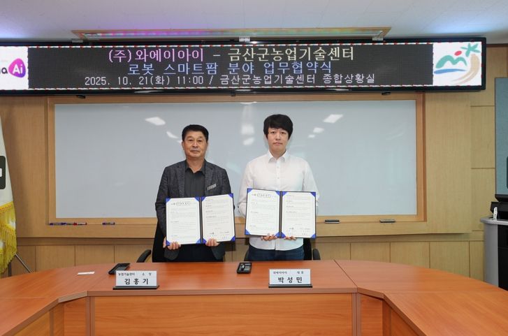 인사이드피플 심정보 기자 | 금산군농업기술센터와 인공지능 로봇 개발 기업 ㈜와에이아이는 지난 21일 센터 종합상황실에서 잎들깨 전용 지능형 수확로봇 개발과 스마트팜 기술 고도화 업무협약을 체결했다.