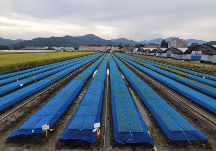 이곳 노지 육묘에 든 비용은 토양 소독, 관수 장치, 피복 자재, 정지기, 진압기 등 330만 원 정도로, 비슷한 규모의 양파 육묘 온실 신축 비용의 10% 수준이다.