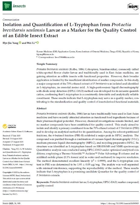 농촌진흥청은 이번 연구로 꽃벵이 추출물의 뼈 건강 개선 지표성분이 L-트립토판임을 밝히고 국제학술지 Insects(IF 2.9)에 논문으로 게재했다. 이로써 꽃벵이를 활용한 기능성 소재 표준화와 품질관리 체계 확립의 과학적 근거를 마련했다.