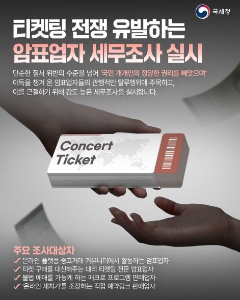 인사이드피플 장은미 기자 | 단순한 질서 위반의 수준을 넘어 '국민 개개인의 정당한 권리를 빼앗으며' 이득을 챙겨 온 암표업자들의 관행적인 탈루행위에 주목하고, 이를 근절하기 위해 강도 높은 세무조사를 실시합니다.