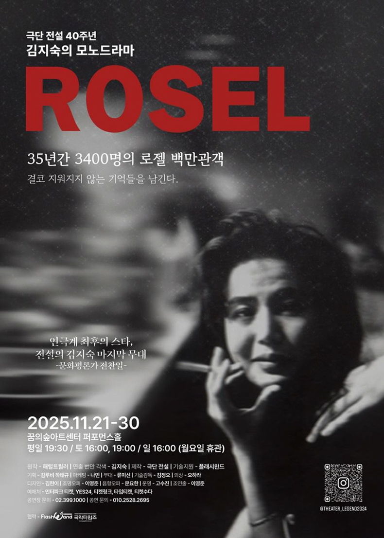 인사이드피플 조은설 기자 | 극단 전설 40주년 기념작이자 배우 김지숙의 마지막 공연인 모노드라마 〈로젤〉이 오는 11월 21일부터 30일까지 꿈의숲아트센터 퍼포먼스홀에서 막을 올린다. 35년간 3,400회 이상 공연되며 백만 명이 넘는 관객을 울린 이 작품은 여성의 주체성과 인간성의 회복을 그린 한국 연극사의 대표작으로 꼽힌다.