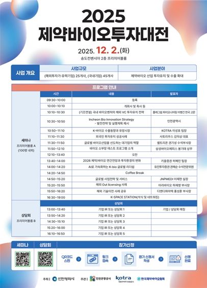 인사이드피플 심정보 기자 | 인천광역시가 주최하고 인천관광공사와 KOTRA, 한국제약바이오협회가 공동 주관하는 ‘제약바이오투자대전’이 오는 12월 2일 인천 송도컨벤시아 프리미어볼룸에서 열린다.