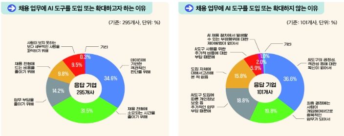 반면에, 도입·확대 계획이 없는 25.5%(101개사) 기업은 ‘AI 도구의 공정성, 객관성 등에 대한 확신이 없어서’(36.6%), ‘최종 결정에는 사람이 개입해야 하므로 중복적인 업무가 되어서’(19.8%)를 주요 이유로 들었는데, 이를 통해 AI 도구의 ‘객관성·공정성·효율성’에 대한 상반된 시각을 확인할 수 있었다.