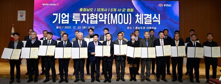 김태흠 지사는 23일 도청 대회의실에서 김석필 천안시장권한대행 등 6개 시군 단체장 또는 부단체장, 박윤수 제이디테크 대표이사 등 18개 기업 대표 등과 투자협약을 체결했다.