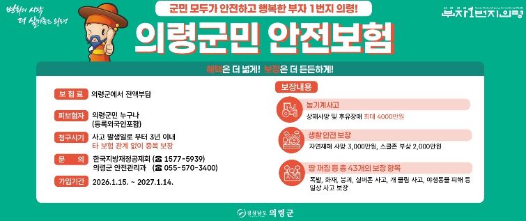 인사이드피플 장은미 기자 | 의령군은 일상생활 중 예기치 못한 재난과 사고로부터 군민의 생활 안정을 지원하기 위해 ‘2026년 군민안전보험’에 갱신 가입하고, 1월 15일부터 본격 운영에 들어간다고 밝혔다.