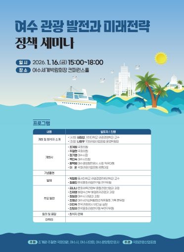 한편 이번 정책 세미나는 여수 관광의 미래 전략을 논의하기 위해 마련된 자리로, 주철현 의원, 여수시, 여수시의회, 여수광양항만공사와 함께 주최하고, 국회관광산업포럼과 공동 주관해 열렸다.