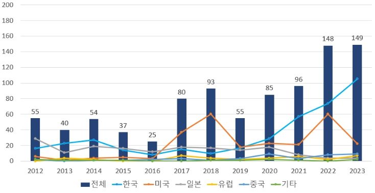 특히, 최근 3년 기준(2021~2023년) 삼성전자(139건)·SK하이닉스(86건)가 1위와 2위를 차지하여 한국이 전 세계 AI 메모리용 강유전체 소자의 연구개발을 주도하고 있음을 확인할 수 있었다.