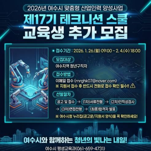 인사이드피플 노재현 기자 | 여수시가 지역 산업 수요에 맞는 전문 인력을 양성하기 위해 추진하는 ‘2026년 여수시 맞춤형 산업인력 양성사업’의 일환인 '테크니션 스쿨 제17기' 교육생을 추가 모집한다고 밝혔다.