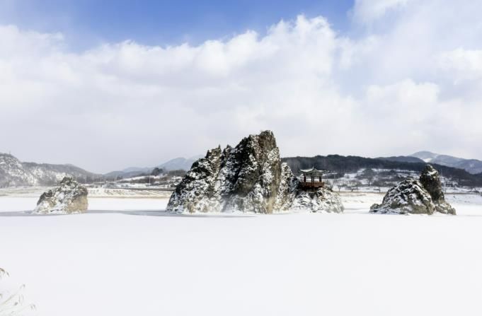 물안개와 설경이 겹쳐지는 겨울 아침의 도담삼봉은 사계절 가운데서도 가장 정적인 아름다움으로 여행객의 시선을 붙잡는다.