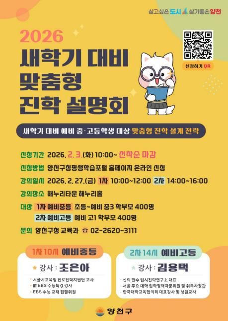 이기재 양천구청장은 “이번 설명회가 새 학기를 앞두고 자녀 교육을 고민하는 학부모와 학생들에게 실질적인 길잡이가 되길 바란다”며 “앞으로도 사교육 부담을 완화하고 공교육과 연계한 맞춤형 진학 지원을 통해 아이들의 미래를 함께 설계해 나가겠다”고 말했다.