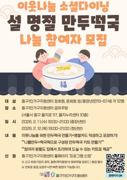 먼저, 소셜다이닝 ‘설 명절 만두떡국 나눔’은 요리 체험과 지역사회 나눔 활동을 연계해 진행된다. 2월 11일과 12일 참여자들이 정성껏 만든 만두떡국 키트와 덕담 카드는 13일 관내 거주 취약 1인가구 20세대에 전달될 예정이다.
