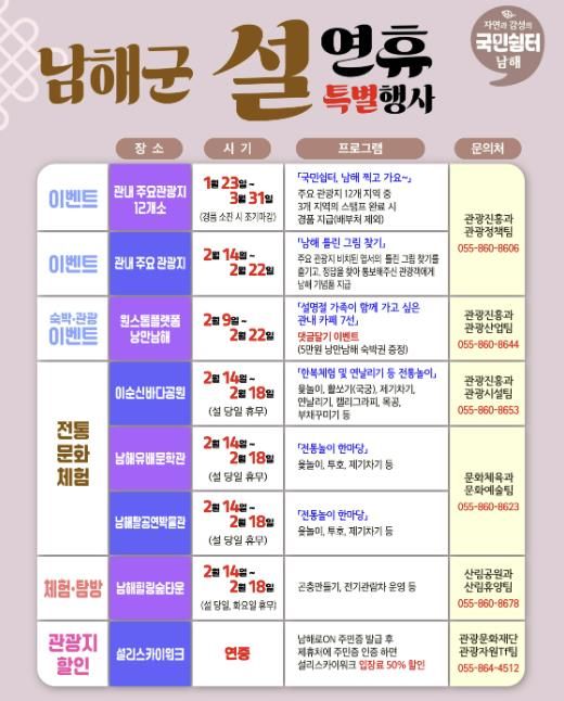 먼저 올해 설 연휴 특별행사의 일환으로 인기 관광지 12개소에서 진행되는 ‘국민쉼터, 남해 찍고 가요’ 스탬프 투어 이벤트가 1월 23일부터 3월 31일까지 열린다. 참가자는 남해군의 주요 관광지 12개 지역 중 3곳을 방문해 관광지에 마련된 스탬프를 찍으면 소정의 경품을 받을 수 있다.