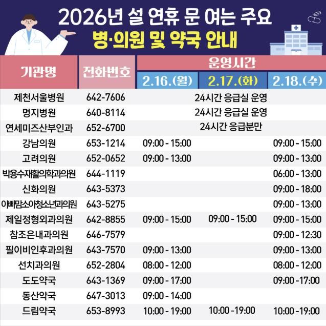 아울러 응급의료기관과 연휴 기간 문 여는 병의원 및 약국을 지정 운영하고 비상진료체계를 유지해 의료 공백을 최소화할 계획이다. 연휴 기간 문 여는 의료기관과 약국 정보는 제천시 보건소(646-2720) 및 시 홈페이지를 통해 적극 홍보할 예정이며 보건복지콜센터, 응급의료포털을 통해서도 확인할 수 있다.