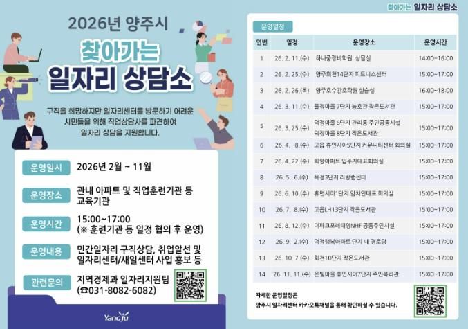 양주시 관계자는 “이번 사업은 시민의 생활권 안으로 직접 들어가 구직 부담을 덜어드리는 데 초점이 맞춰져 있다”며 “앞으로도 현장의 목소리를 반영한 수요자 중심의 일자리 행정을 지속적으로 강화하겠다”고 전했다.