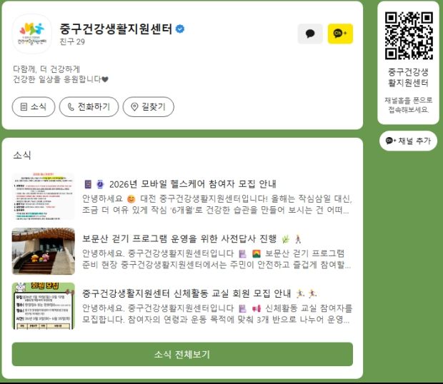 인사이드피플 장은미 기자 | 대전 중구는 주민들에게 보다 폭넓고 신속한 건강 정보와 중구건강생활지원센터에서 추진하는 각종 사업 정보를 제공하기 위해 카카오톡 채널을 개설・운영한다고 8일 밝혔다.