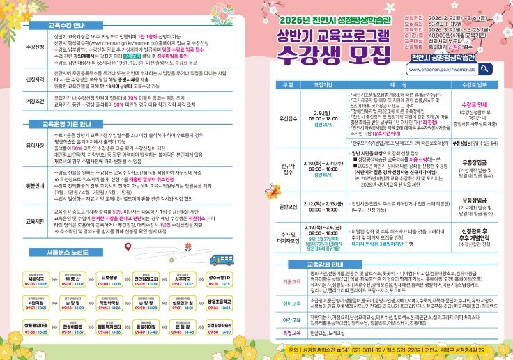 상반기 교육과 관련한 자세한 사항은 천안시 평생학습포털 누리집을 확인하거나 성정평생학습관으로 문의하면 된다.