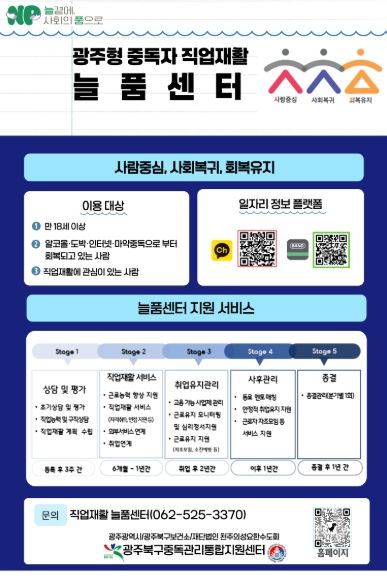 광주시는 중독자 직업재활 전담기관인 ‘늘품센터’에 위탁, 지원사업을 운영하고 있다. 18세 이상 중독 회복자 가운데 직업재활 욕구가 있거나 유관기관이 의뢰한 대상자가 지원사업을 이용할 수 있다.