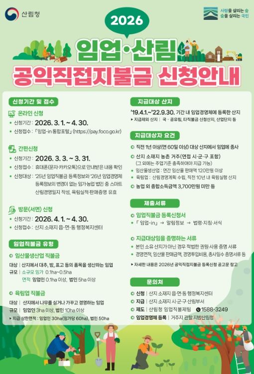 인사이드피플 심정보 기자 | 청양군이 임업인의 소득을 보전하고 산림의 공익적 가치를 높이기 위해 ‘2026년 임업·산림 공익직접지불금’ 신청 접수를 내달 4일부터 시작한다.