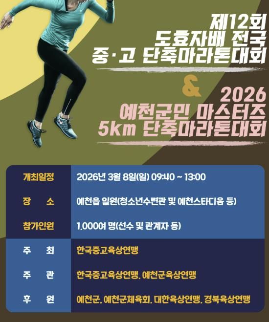 인사이드피플 강애자 기자 | 예천군은 오는 8일 오전 10시부터 예천읍 일원에서 '제12회 예천 도효자배 전국 중·고 단축마라톤대회' 및 '2026 예천군민 마스터즈 단축마라톤대회'를 개최한다고 밝혔다.