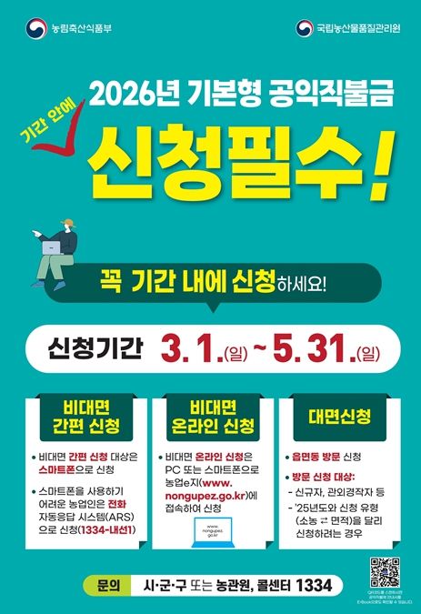 인사이드피플 심정보 기자 | 강원특별자치도는 2026년 기본형 공익직불금 신청을 3월 1일부터 5월 31일까지 3개월간 접수한다고 밝혔다.