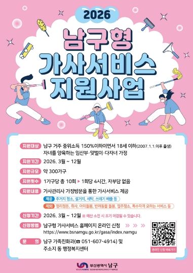 신청은 남구청 홈페이지 상단의 ‘남구형 가사서비스’ 메뉴 또는 온라인으로 신청할 수 있다. 접수는 3월부터 선착순으로 진행되며 예산 소진 시 조기 마감될 수 있다.