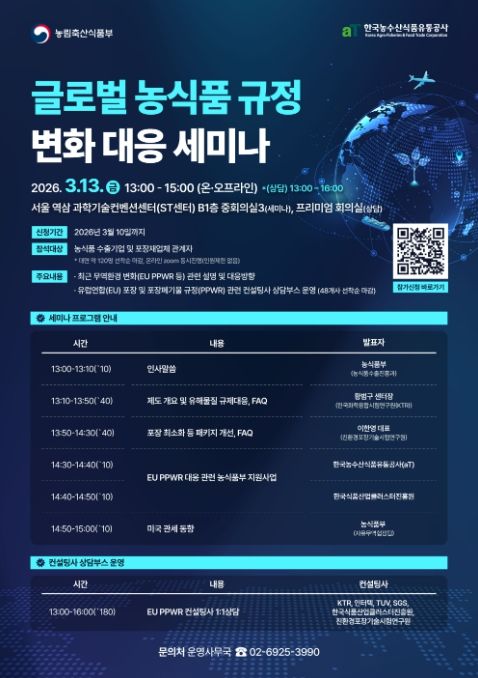 이번 세미나는 오프라인과 온라인(생중계)으로 동시 진행되며, 포스터 상의 QR코드 또는 신청 링크를 통해 참가를 신청할 수 있다. 오프라인 참가는 3월 10일까지 신청 가능하며, 온라인 생중계 참석은 3월 12일까지 신청할 수 있다.