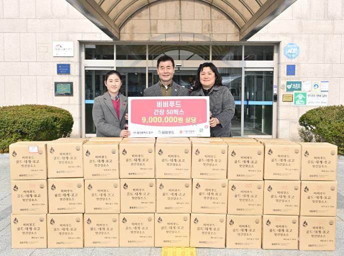 인사이드피플 노재현 기자 | 비비푸드가 3월 17일 오전 11시 중구청 구청장실을 찾아 울산사회복지공동모금회를 통해 이웃돕기 후원 물품으로 900만 원 상당의 배로 만든 간장 600병을 전달했다.