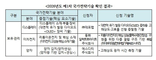 인사이드피플 조은설 기자 | 과학기술정보통신부와 한국과학기술기획평가원(원장 직무대행 황지호,)은 ‘2026년도 제1차 국가전략기술 확인 신청’에 대해 총 3건의 기술(디스플레이, 이차전지, 양자 분야)이 국가전략기술에 해당하는 것으로 확인했다.