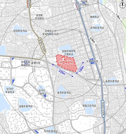 대상지는 역세권(삼양사거리역 반경 180m, 미아사거리역 반경 580m) 및 중심지 배후주거지로, 솔샘로에 면한 우수한 입지에도 불구하고 수십 년간 가로구조를 유지한 채 주거환경 노후화가 지속됐다.
