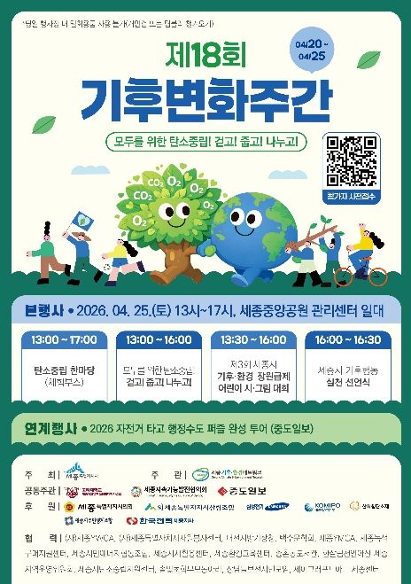 인사이드피플 강애자 기자 | 세종특별자치시가 20일부터 25일까지 6일간 중앙공원 일대에서 ‘제18회 기후변화주간’ 행사를 개최한다.